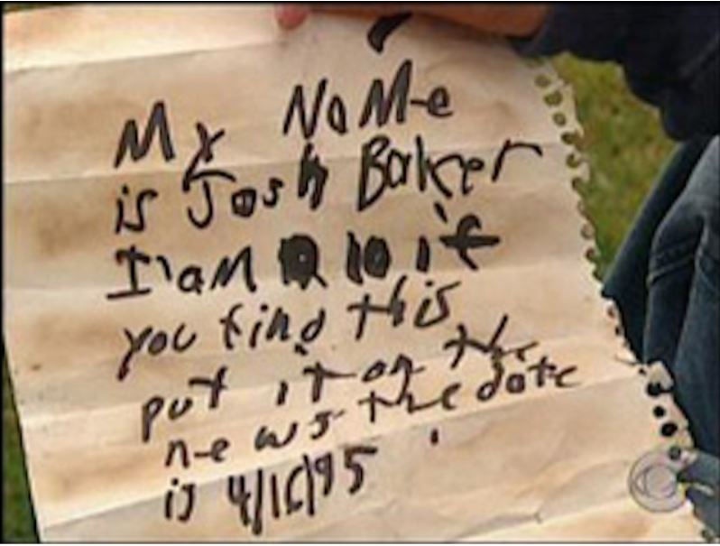 Spunea simplu: „Numele meu este Josh Baker. Am 10 ani. Dacă găsești asta, pune-o la știri.”