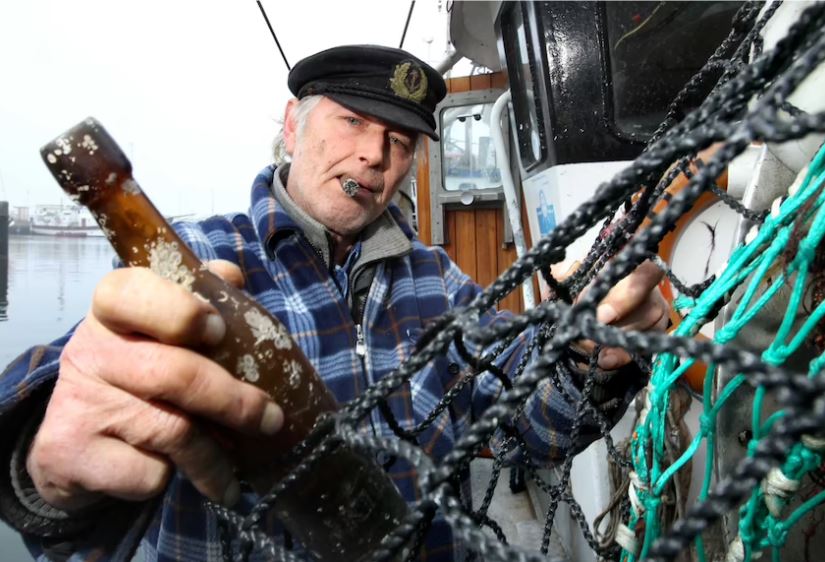 Un pescar a scos sticla de bere cu mesajul scris de mână din Marea Baltică, în apropierea orașului Kiel, în martie 2014.