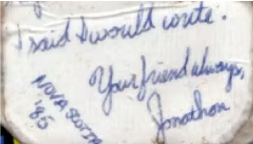 „Mary, ești cu adevărat o persoană grozavă. Sper să putem păstra legătura. Ți-am spus că voi scrie. Al tău prieten mereu, Jonathon, Noua Scoție, 1985.”