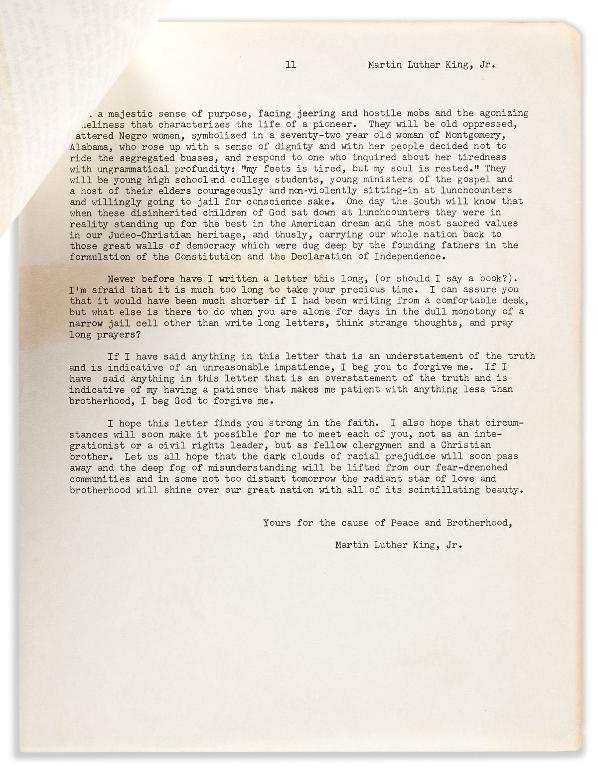“Nu pot să stau cu brațele încrucișate în Atlanta și să nu fiu îngrijorat de ceea ce se întâmplă la Birmingham. Nedreptatea oriunde este o amenințare la adresa justiției de pretutindeni. Suntem prinși într-o rețea inevitabilă de mutualitate, legată într-o singură haină de destin. Orice afectează pe cineva în mod direct, îi afectează pe toți în mod indirect”, scria King. “Știm din experiența dureroasă că libertatea nu este niciodată oferită în mod voluntar de către opresor, ea trebuie cerută de către cel oprimat”, continua el.