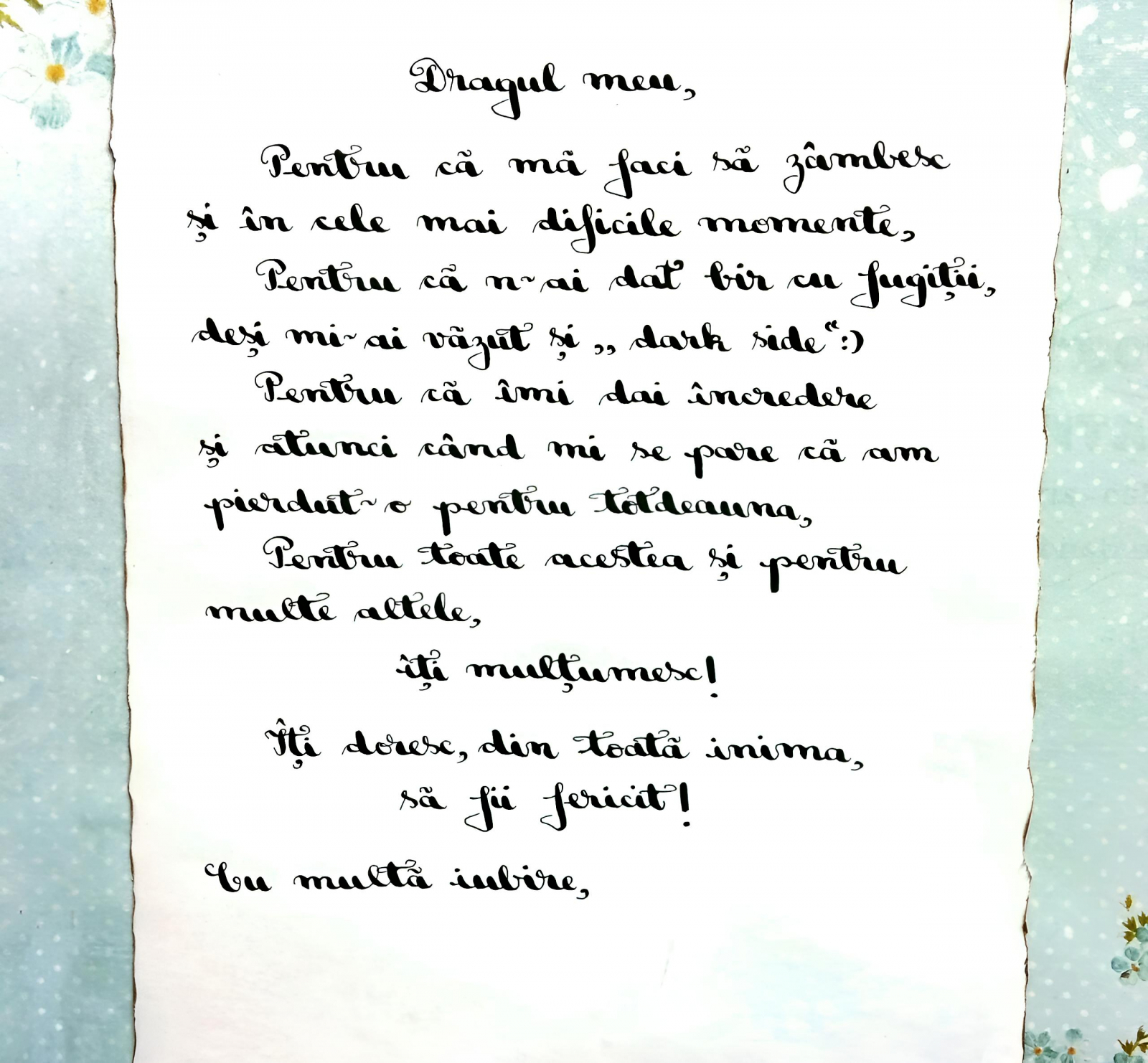 Dacă preferi ca scrisoarea să conțină un mesaj creat de tine, în limita a 50 de cuvinte, trimite-ni-l la contact@safiescrisori.ro