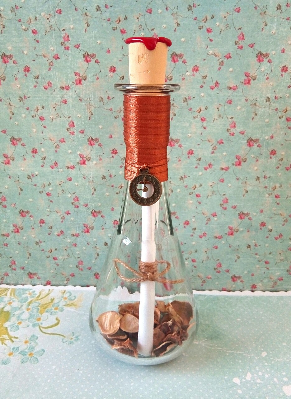 Scrisoare tip papirus scrisă cu toc, peniță și o cerneală extraordinară pe hârtie arsă pe margini, rulată sub formă de papirus. Găzduită de o sticlă decorată cu panglică dublu satinată, un mini-ornament din bronz de inspirație vintage, plante uscate, discret parfumate în interior și sigiliu din ceară aplicat pe dopul de plută, această scrisoare reprezintă un cadou original pentru un iubit excepțional!