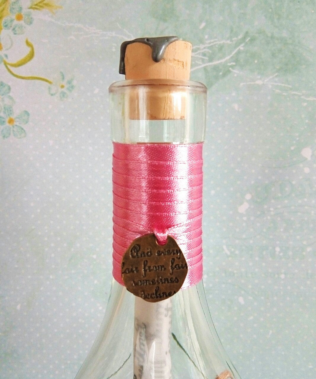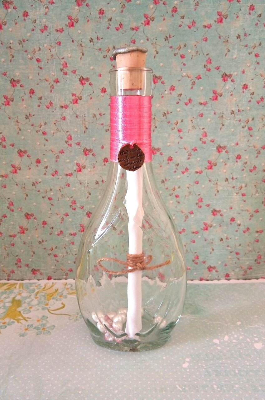 Scrisoarea este găzduită de o sticlă decorată în ton optimist. Panglica delicată din satin și mini-ornamentul elegant din bronz, alături de mărgelele din interior și ceara de pe dopul de plută creează împreună un cadou original!