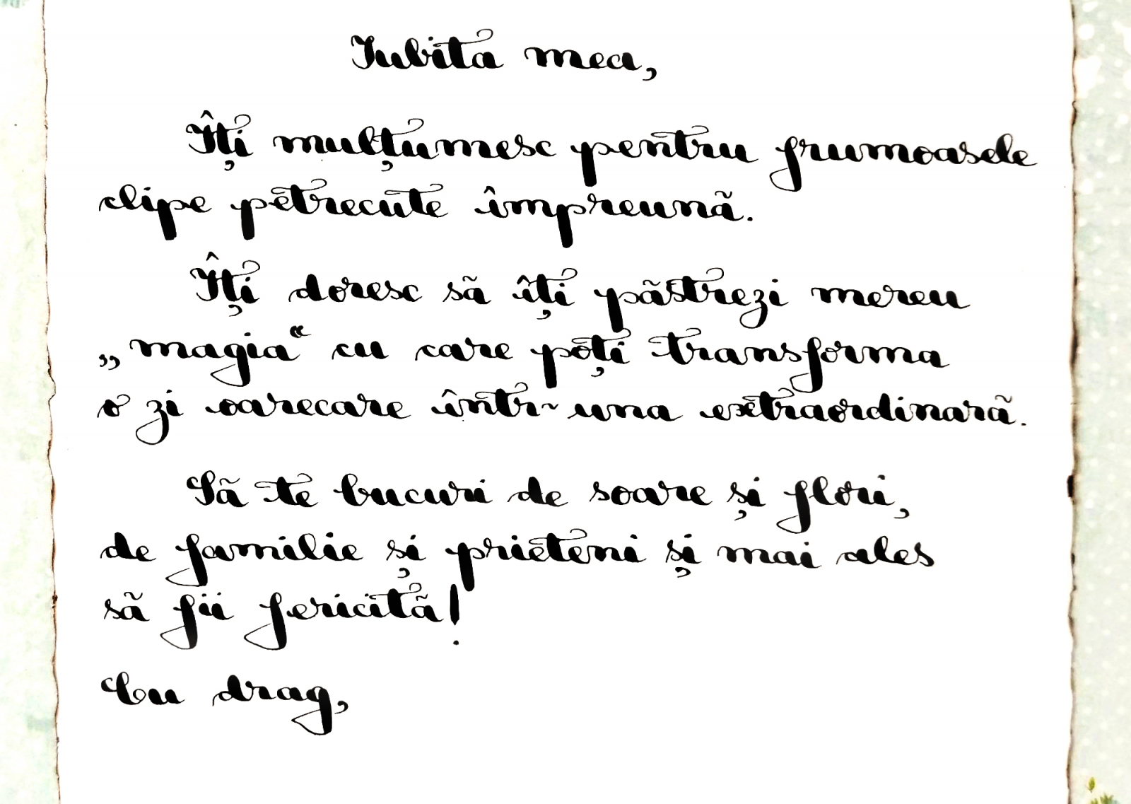 Dacă preferi ca scrisoarea să conțină un mesaj creat de tine, în limita a 50 de cuvinte, trimite-ni-l la contact@safiescrisori.ro