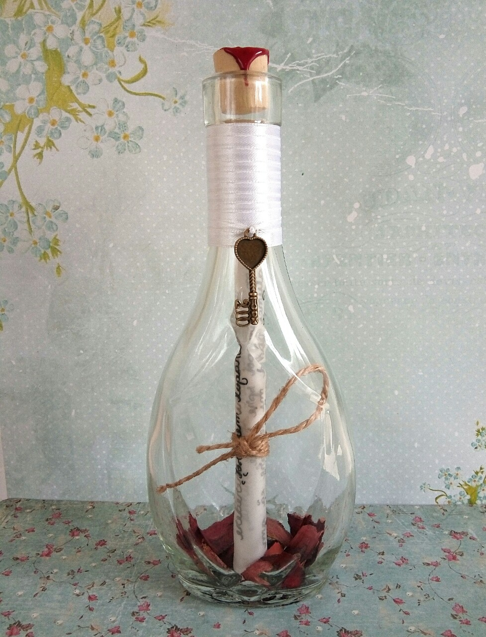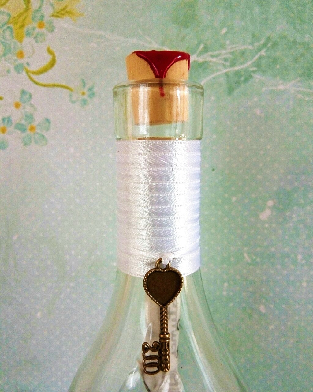 Scrisoarea este "găzduită" de o sticla decorată simplu și elegant - panglica din satin și cheița din bronz sunt în armonie perfectă cu pot-pourri-ul din interior și ceara de pe dopul de plută, ambele roșii.