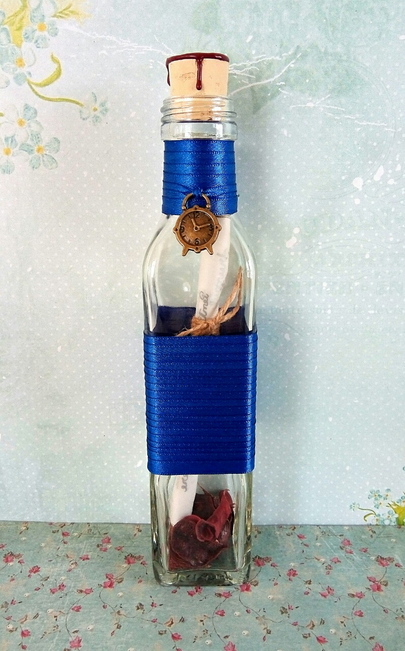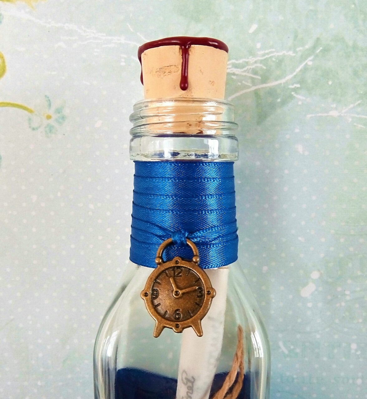 Scrisoarea este găzduită de o sticlă îmbrăcată în panglică delicată din satin și decorată cu un mini-ornament elegant din bronz.