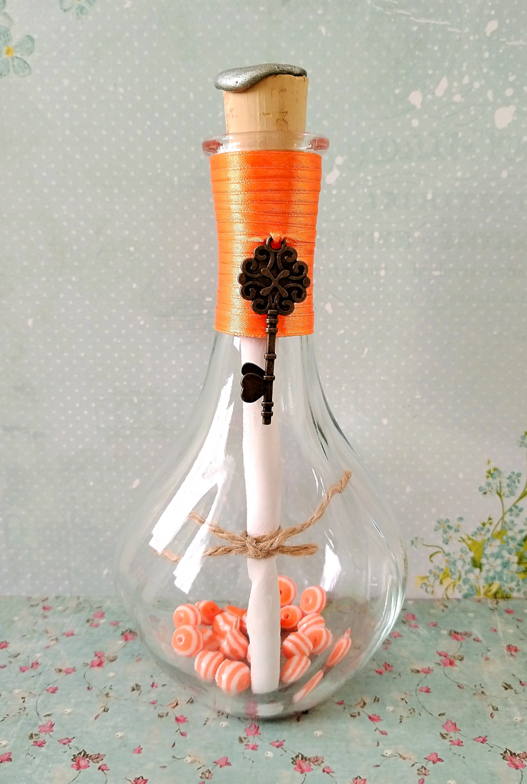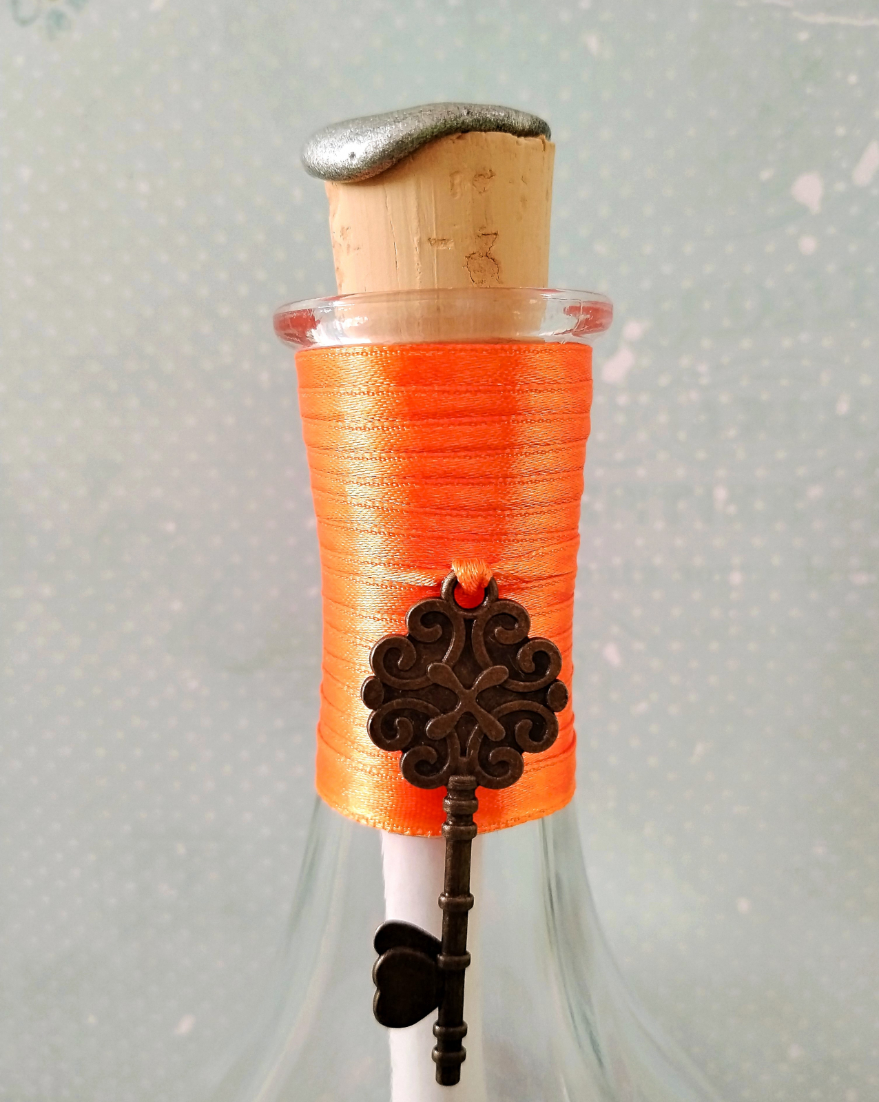 Scrisoarea este găzduită de o sticlă cu formă și ținută elegante. Panglica din satin delicat este în deplină armonie cu mini-ornamentul rafinat din bronz, iar mărgelele din interior se potrivesc perfect cu ceara de pe dopul de plută.