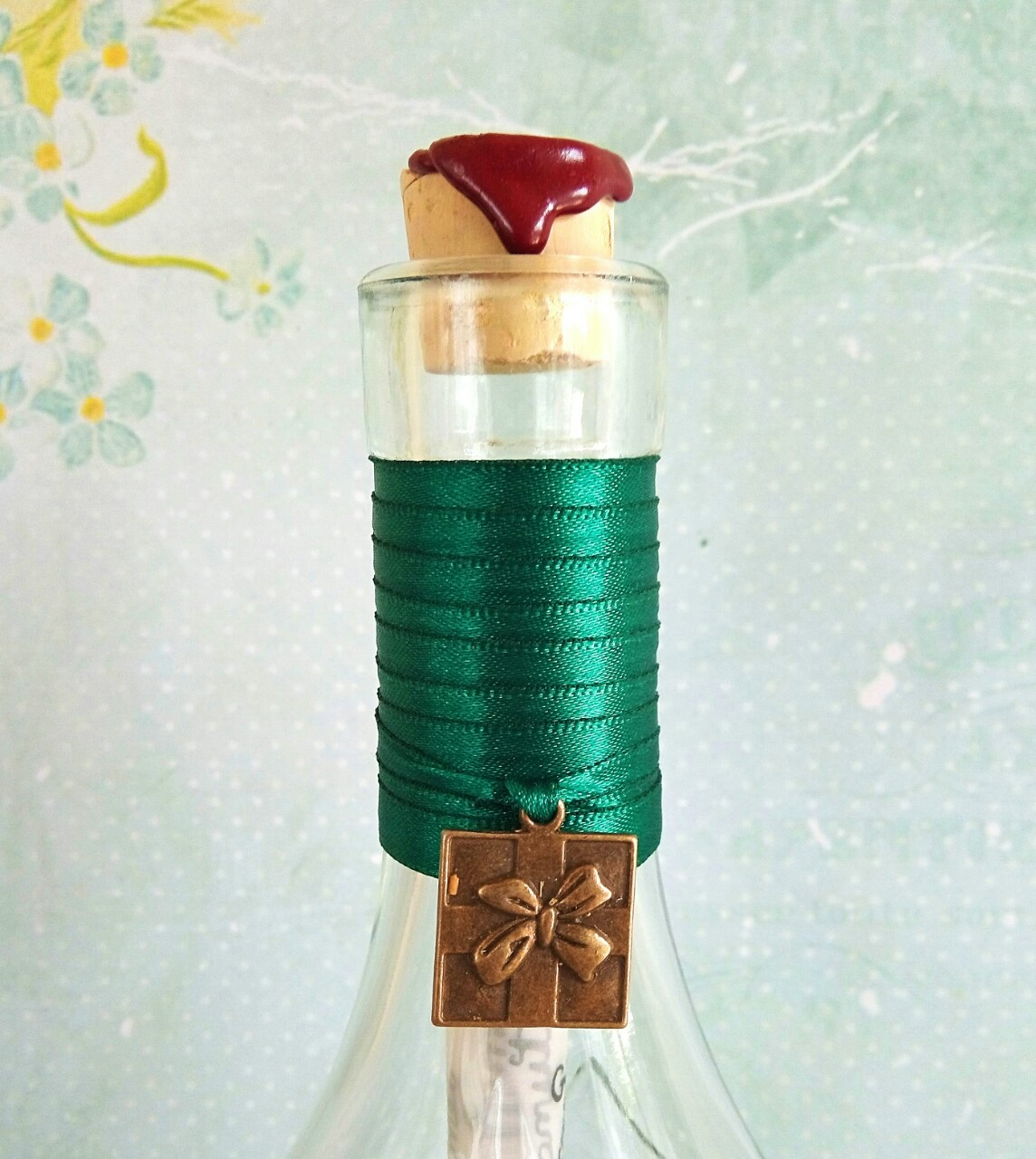 Scrisoarea este găzduită de o sticlă decorată în ton optimist. Panglica din satin verde este în armonie cu pot-pourri-ul din interior, iar mini-ornamentul din bronz și ceara de pe dopul de plută creează împreună un cadou elegant pentru o mamă extraordinară!