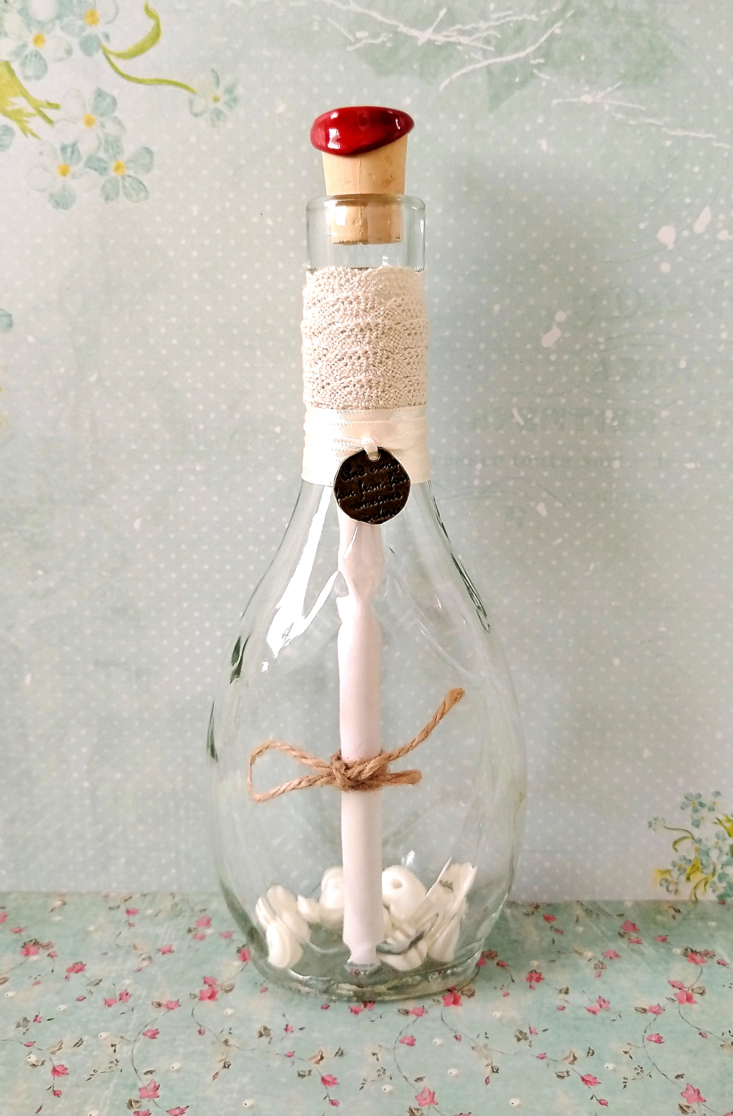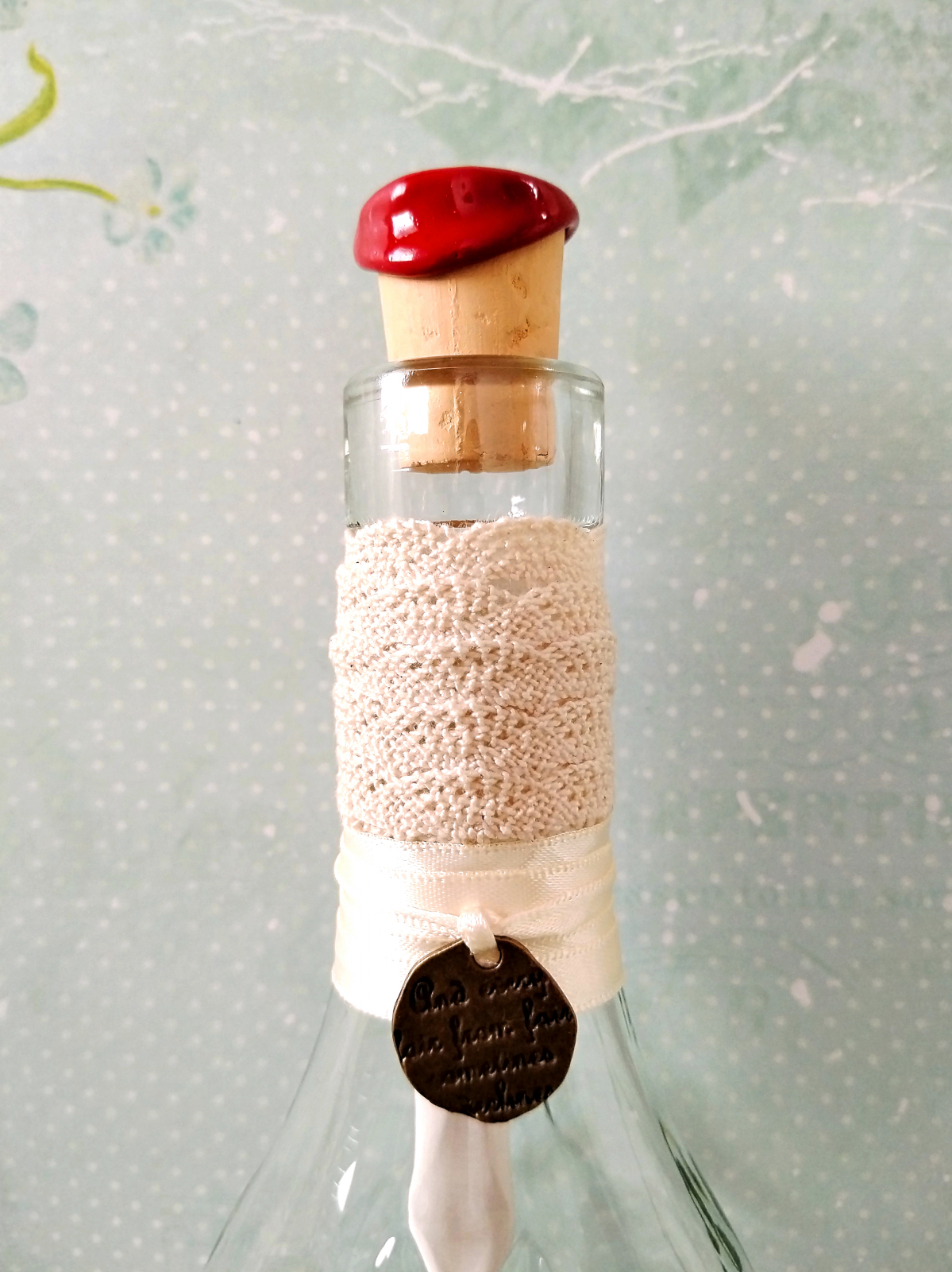 Pentru a sărbători o mama excepțională, scrisoarea este găzduită de o sticlă decorată elegant: dantela delicată, panglica din satin și mini-ornamentul din bronz sunt desăvârșite de mărgelele din interior și ceara de pe dopul de plută.