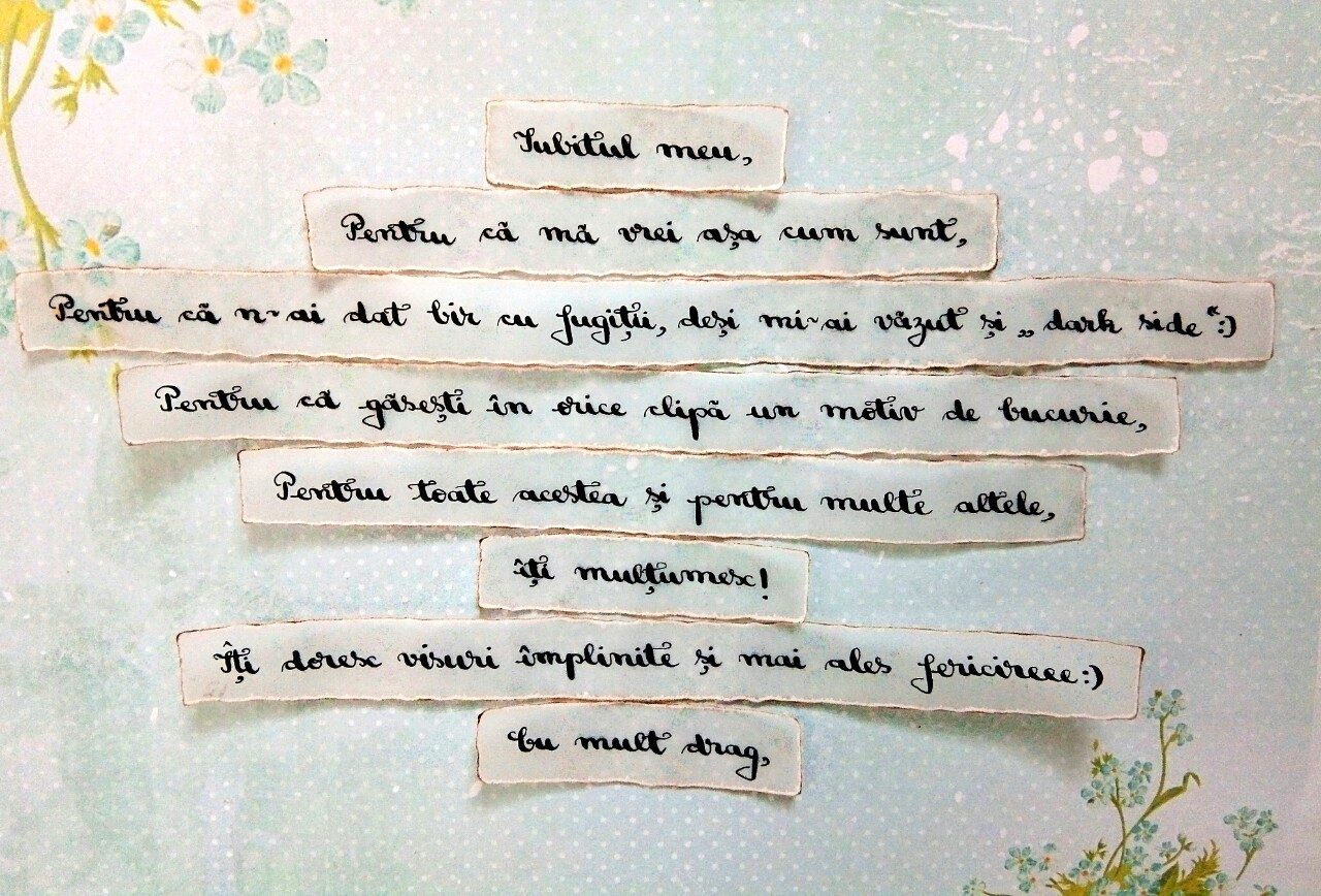 Scrisoare tip puzzle scrisă cu toc, peniță și cerneală neagră specială pe bilețele din hârtie de calc, arse pe margini. Mesajul este împărțit pe mai multe bilețele și destinatarul îl va descifra punându-le în ordine, asemeni dezlegării unui puzzle.