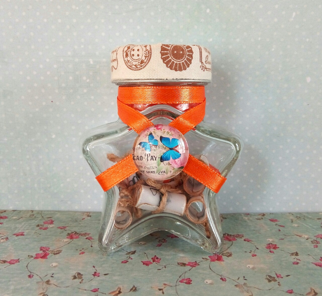Scrisoarea este găzduită de un mini-borcan în formă de stea, decorat cu panglică elegantă din satin și un mini-ornament delicat. Capacul îmbrăcat în hârtie de carte și panglică textilă și plantele uscate, discret parfumate din interior desăvârșesc acest cadou original pentru o soră excepțională!