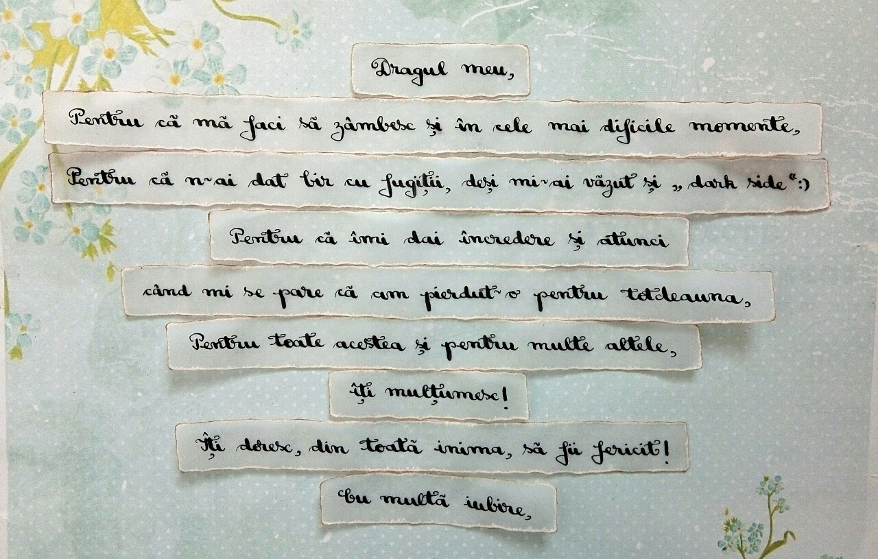 Scrisoare tip puzzle scrisă cu toc, peniță și o cerneală superbă pe hârtie de calc, arsă pe margini. Mesajul este împărțit pe mai multe bilețele și destinatarul îl va descifra punându-le în ordine, asemeni dezlegării unui puzzle.