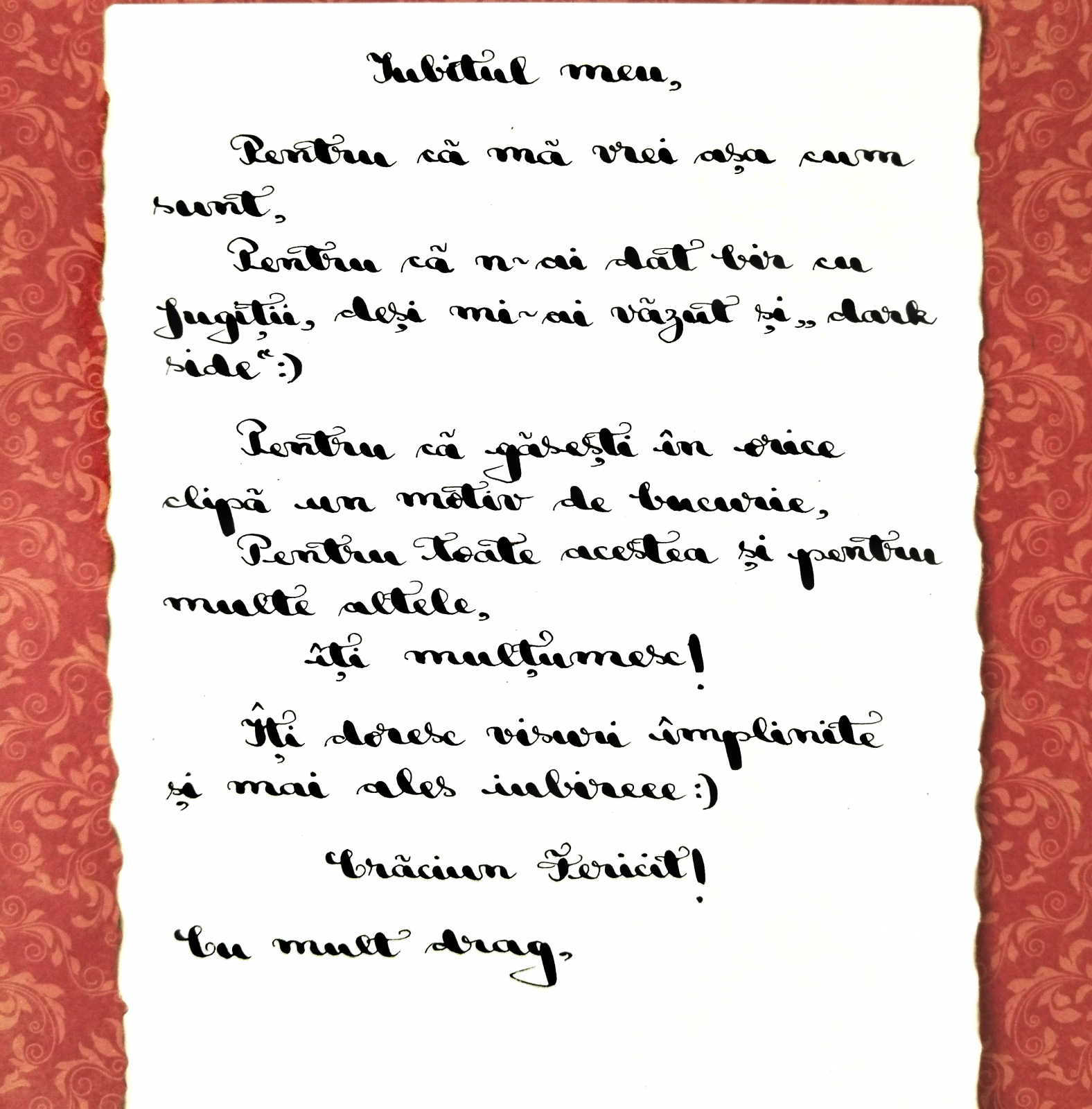 Scrisoare tip papirus scrisă cu toc, peniță și o cerneală extraordinară pe hârtie specială arsă pe margini.