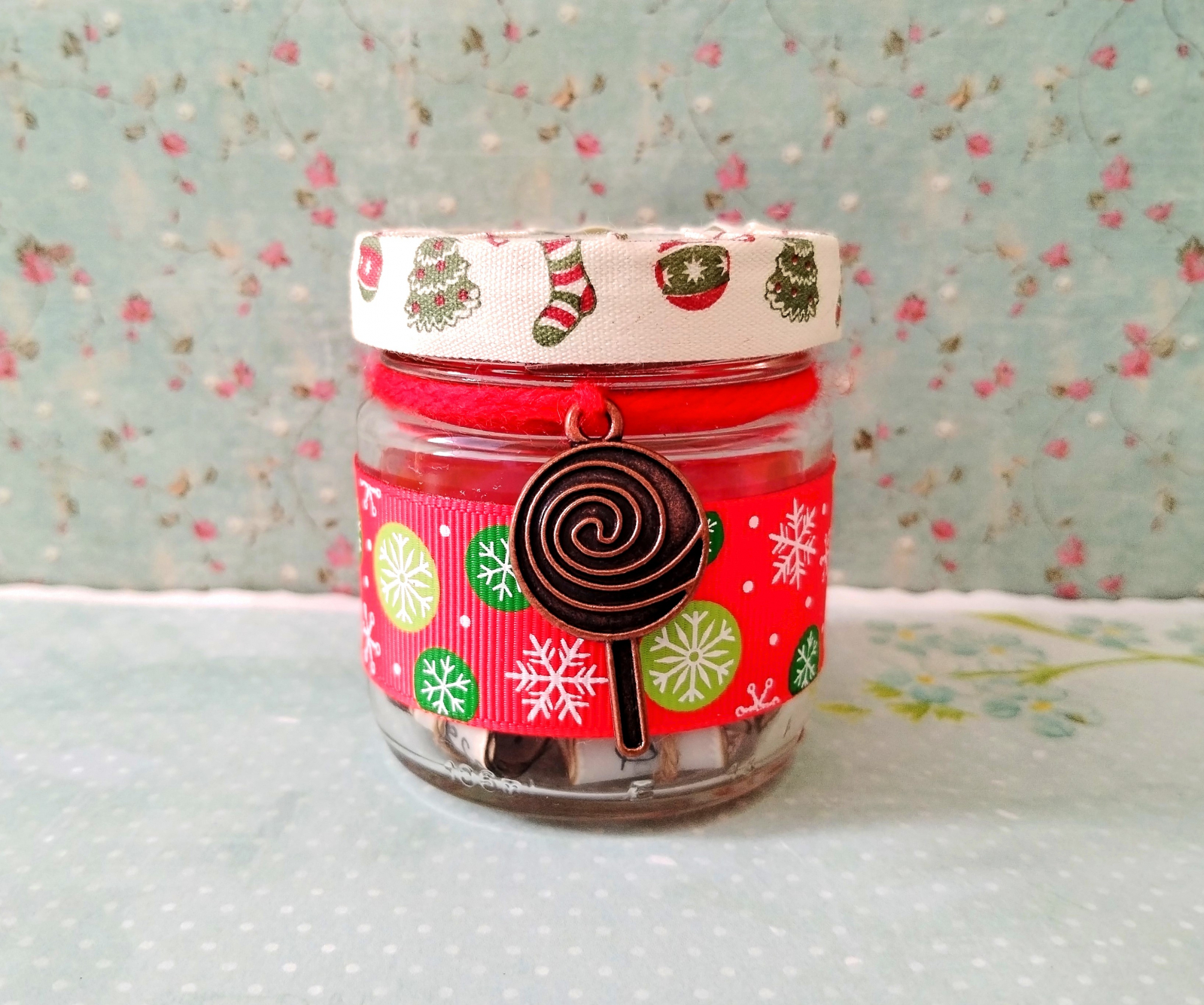 Mini-ornamentul din bronz și panglica decorativă sunt în deplină armonie cu capacul îmbrăcât în panglică textilă în ton cu Sărbătorile de Iarnă.