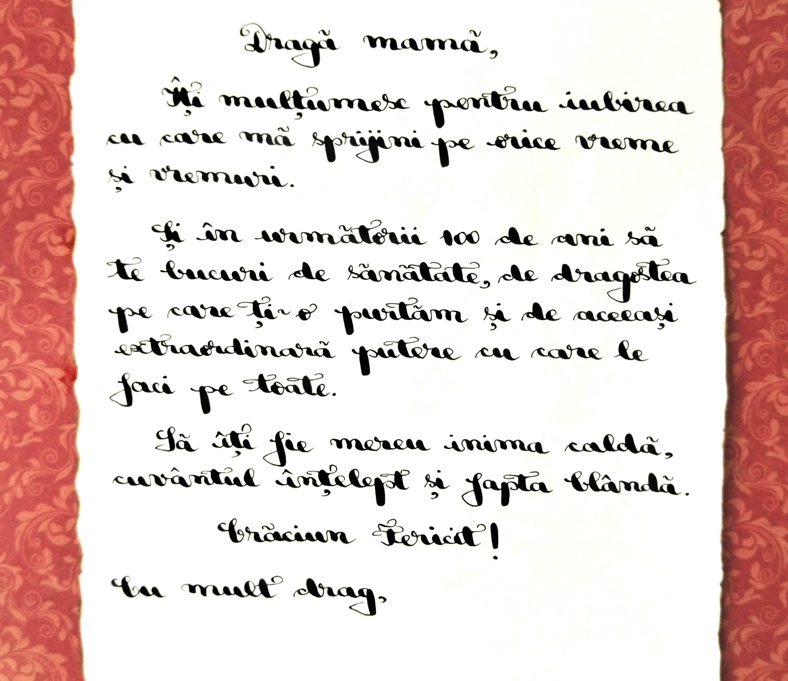 Scrisoare tip papirus scrisă cu toc, peniță și o cerneală excepțională pe hârtie specială arsă pe margini.