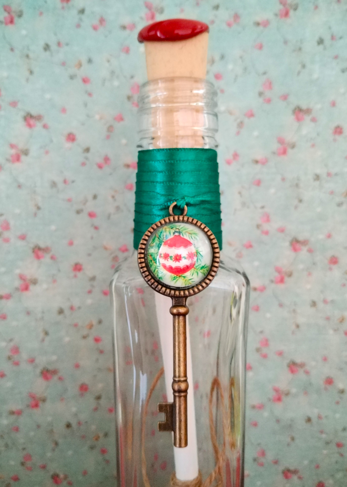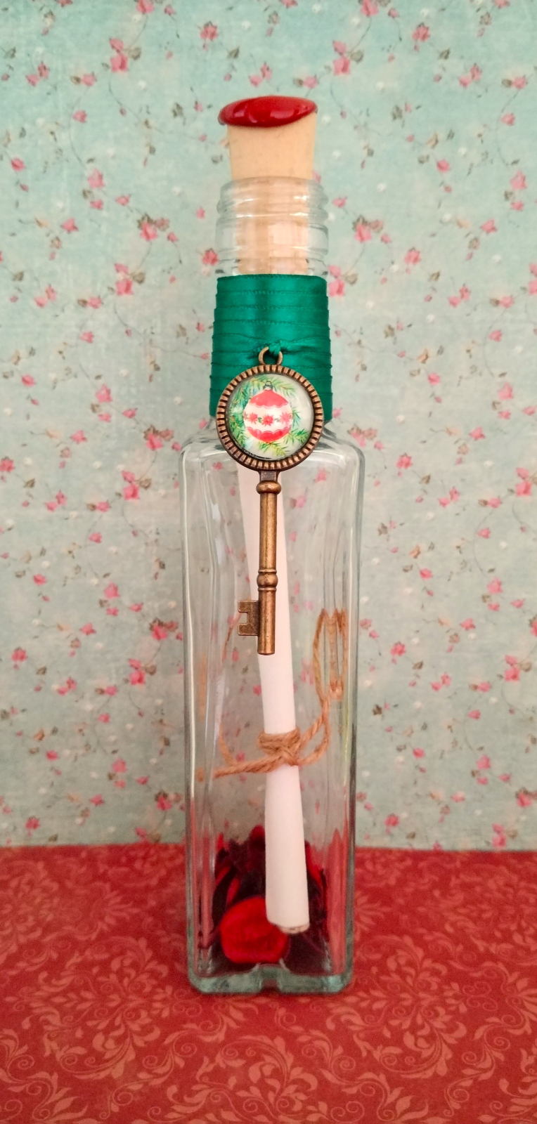 Pentru nași - prieteni și sprijin atât în clipele frumoase, cât și în cele de încercare, scrisoarea este găzduită de o sticlă decorată în stil elegant: panglica din satin verde și mini-ornamentul de sezon în cheie din bronz sunt în deplină armonie cu pot-pouri-ul discret parfumat din interior și ceara de pe dopul de plută.