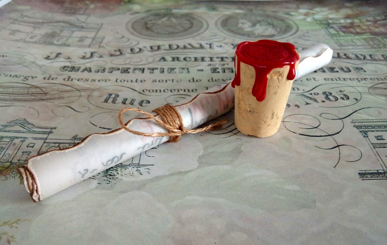 Scrisoare tip papirus scrisă cu toc, peniță și o cerneală extraordinară pe hârtie arsă pe margini, rulată sub formă de papirus.