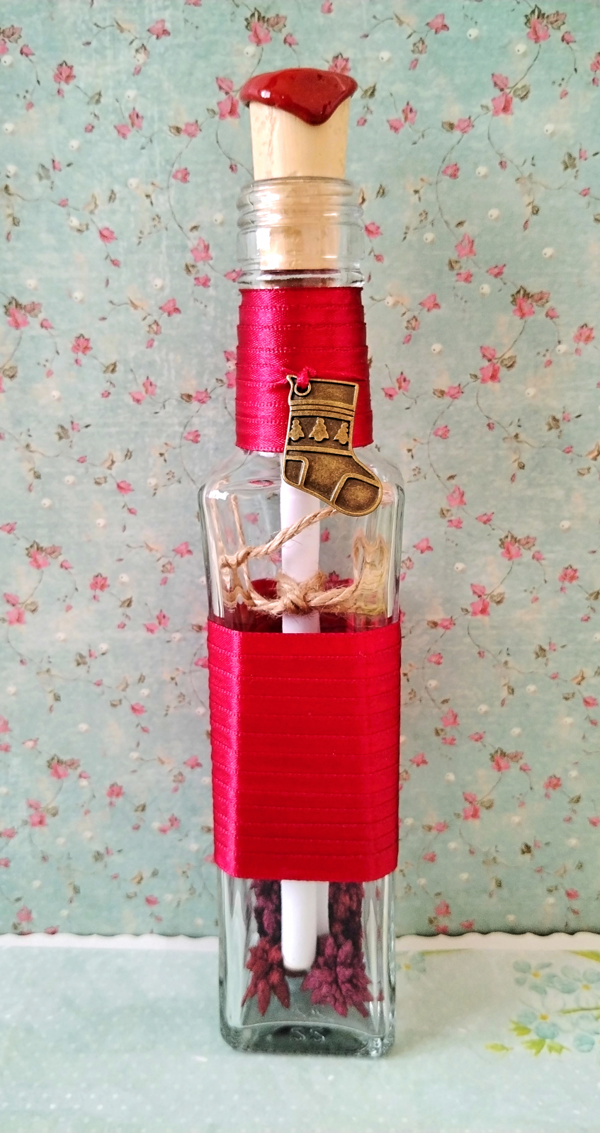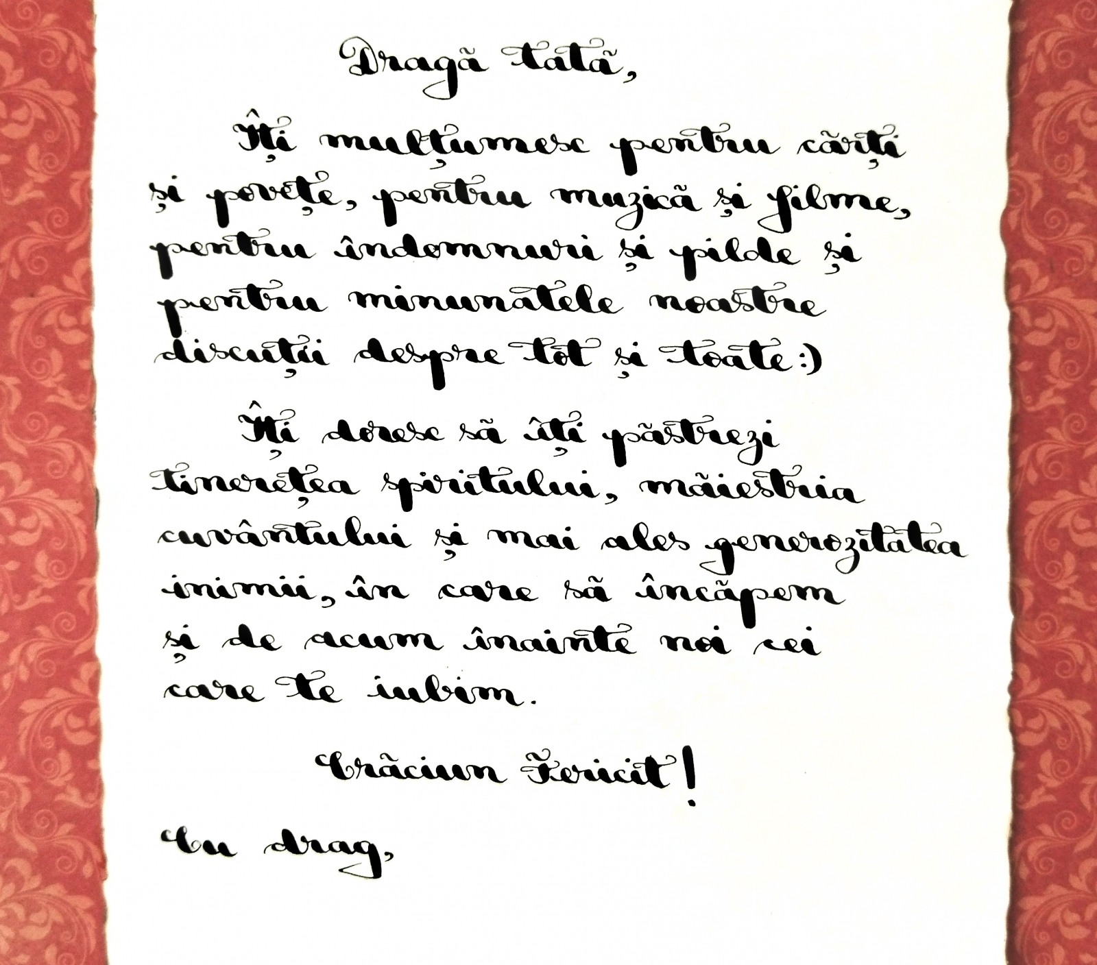 Scrisoare tip papirus scrisă cu toc, peniță și o cerneală superbă pe hârtie specială arsă pe margini. Scrisoarea este găzduită de o sticlă decorată special pentru a bucura un tată extraordinar. Panglica și mini-ornamentul din bronz creează, alături de ceara de pe dopul de plută, un cadou de Crăciun inspirat și original! Dacă preferi ca scrisoarea să conțină un mesaj creat de tine, în limita a 50 de cuvinte, trimite-ni-l la contact@safiescrisori.ro Iar dacă vrei să compunem noi mesajul, adaugă în “Coș” produsul “Mesaj personalizat compus de noi - pentru scrisoare tip papirus în sticlă” și noi te vom contacta pentru a stabili detaliile.