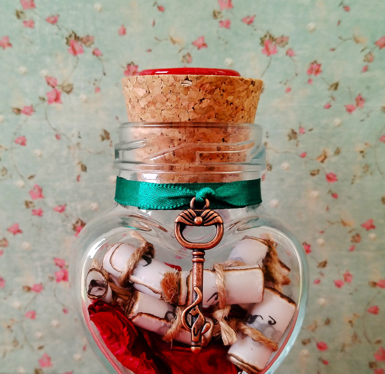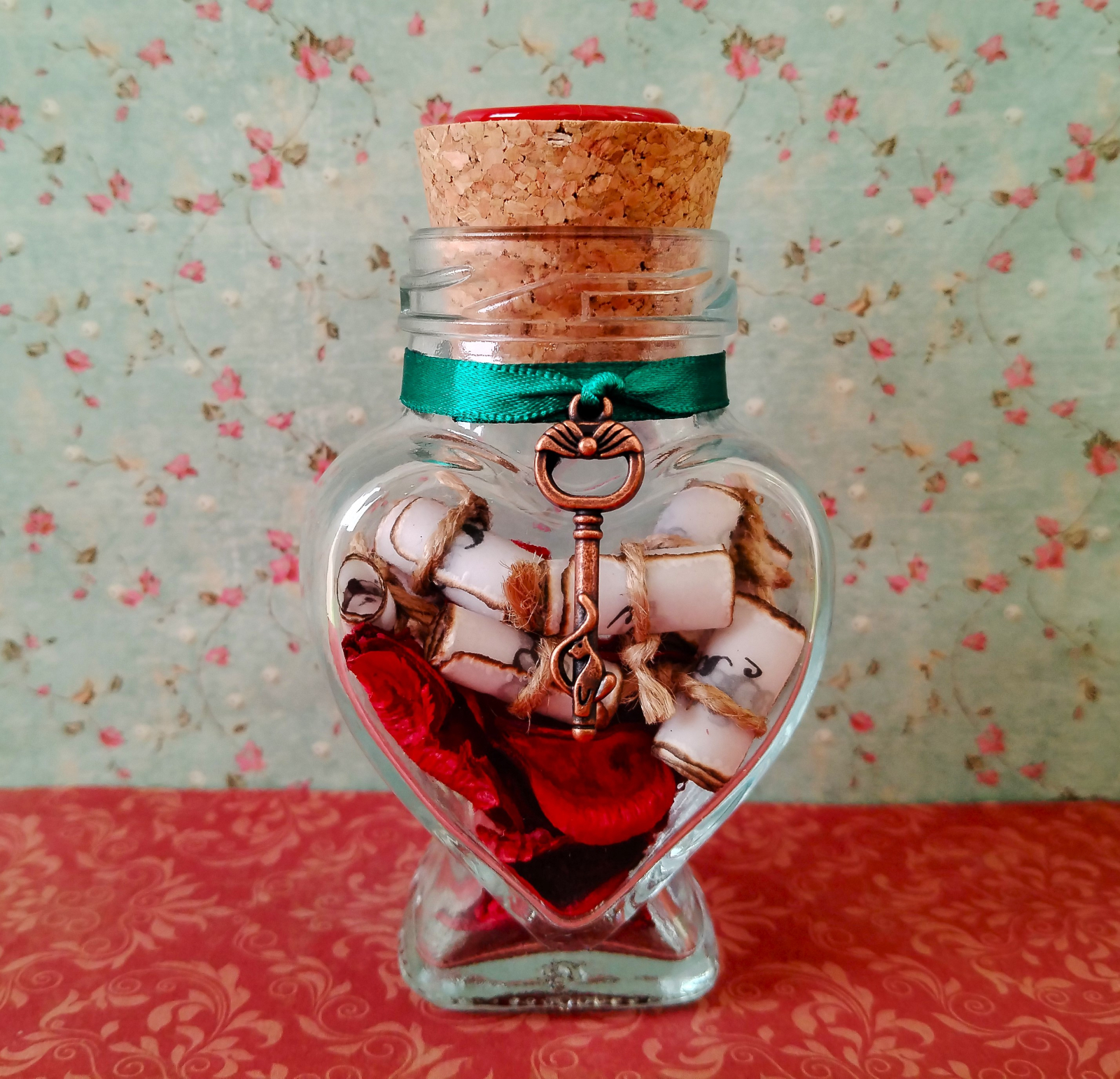 Punând bilețelele arse pe margini, rulate și legate cu sfoară de iută în ordine, destinatarul scrisorii va descifra mesajul livrat în borcanul în formă de inimă decorat cu panglică din satin, un mini-ornament elegant din bronz, ceară pe dopul de plută și desăvârșit de pot-pourri-ul discret parfumat din interior.